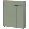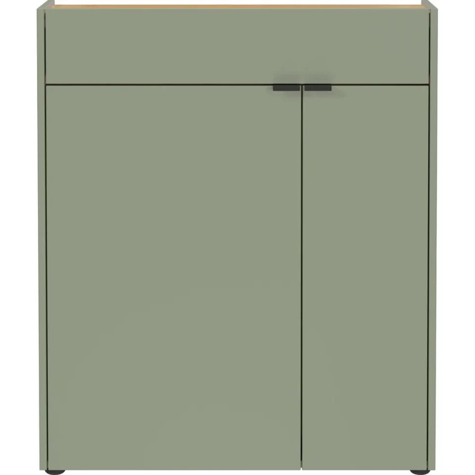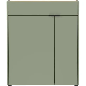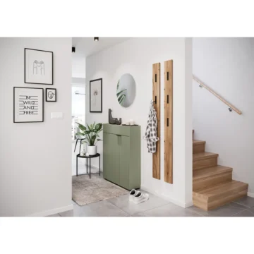 Omarica za čevlje Ameca združuje funkcionalnost, sodoben videz in kakovostne materiale, kar jo naredi idealno izbiro za predsobe in hodnike. Elegantna barvna kombinacija taupe zelene in dekorja Navarra hrasta ustvarja prijetno in urejeno vzdušje ob vstopu v dom.