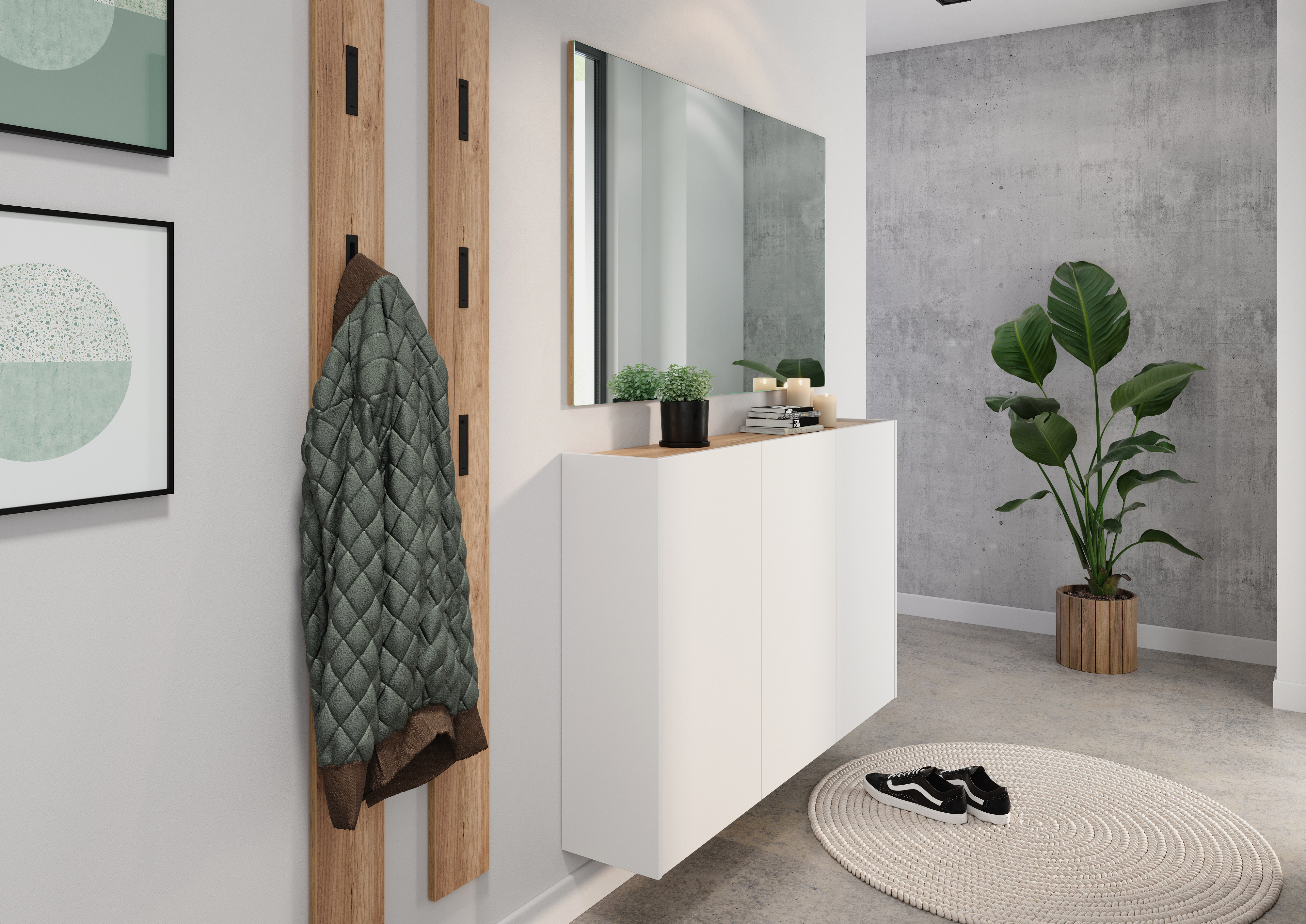 Kompaktna rešitev za shranjevanje v manjših prostorih, ki nudi dovolj prostora za vsakodnevne predmete ter s svojo svežo estetiko dopolni sodobne predsobe.