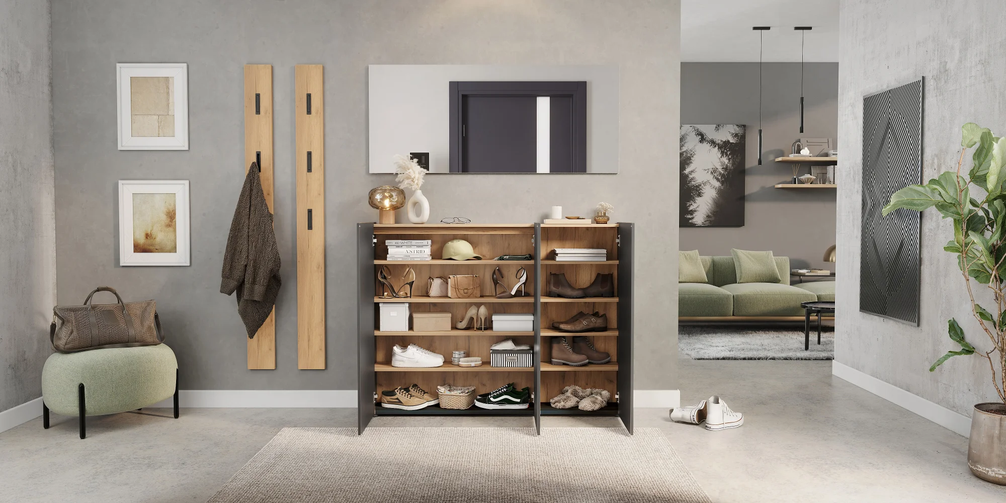 Kompaktna rešitev za shranjevanje v manjših prostorih, ki nudi dovolj prostora za vsakodnevne predmete ter s svojo svežo estetiko dopolni sodobne predsobe.