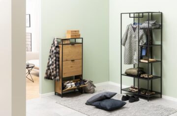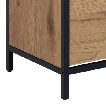Seaford omarica za čevlje, okvir in podstavek iz črnega praškasto prevlečenega jekla, 3 predali iz melamina z videzom divjega hrasta, odprt predel, dimenzije Š 56x G 30 x V 129 cm.