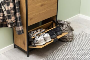Potrebujete več prostora v hodniku? Ta omarica za čevlje bo poskrbela, da bodo vaši čevlji imeli svoj dom. Organizirajte svoje čevlje v treh predelih, pri čemer vsak predel nudi dve sekciji za čevlje. Videza divjega hrasta, v kombinaciji s črnim jeklenim okvirjem, bo modern dodatak v vsakem domu.