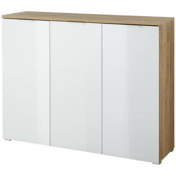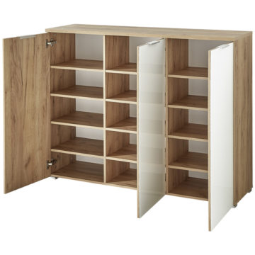 Omarica za čevlje Telde je idealna za predsobni prostor, saj je zaradi velikega števila polic prostora za do 30 parov čevljev, ki jih lahko nastavite po višini. Fronte so nadgrajene s kaljenim steklom, ki skrbi za lažje čiščenje in kovisnke ročaje. S svojo barvno kombinacijo bele in hrasta navarra se prilega tako tradicionalno kot modernim zasnovanim bivalnim prostorom.  Vsi robovi so zaščiteni s kvalitetnim ABS robom. Vse površine, ki so dodatno zaščitene z melaminskim premazom, ki še dodatno ščiti pred umazanijo. Dimenzije omarice so (širina, višina, globina): 134 x 105 x 40 cm. Predsoba Telde je delo nemškega proizvajalca Germania Rok dobave je 3 – 45 dni.
