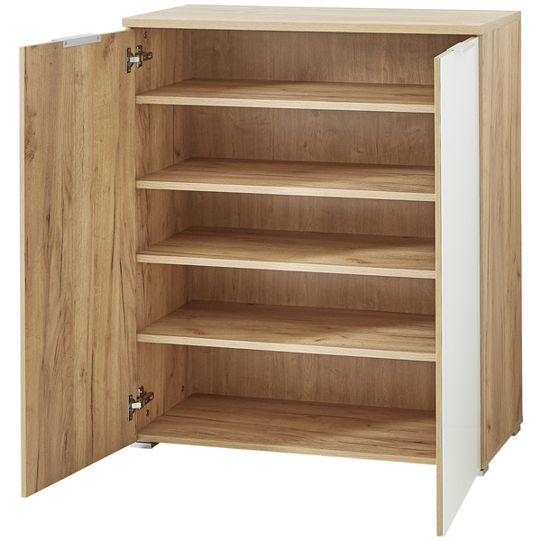 Omarica za čevlje Telde je idealna za predsobni prostor, saj je zaradi velikega števila polic prostora za do 20 parov čevljev, ki jih lahko poljubno nastavite po višini. S svojo barvno kombinacijo bele in hrasta navarra se prilega tako tradicionalno kot modernim zasnovanim bivalnim prostorom. Fronte so nadgrajene s kaljenim steklom, ki skrbi za lažje čiščenje, poleg tega pa se mehko zapirajo. Vsi robovi so zaščiteni z kvalitetnim ABS-om. Vse površine so dodatno zaščitene z melaminskim premazom, ki še dodatno ščiti pred umazanijo. Ima kovisnke ročaje.