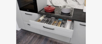 V predalnik širine 80 cm je mogoče vgraditi dva organizatorja pribora v element širine 90 cm pa največ dva organizatorja.