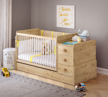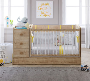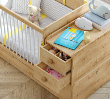 Otroška posteljica Mocha Baby ima rastočo funkcijo za naslednja leta – to pomeni, da se lahko iz zibelke enostavno preoblikuje v enojno posteljo in omarico. Preoblikovanje je prikazano na sliki. Postelja je primerna za vzmetnico dimenzije 70×115 – 70×160 cm. Ima zaobljene ročaje za lažje odpiranje predalov, ki se mehko zapirajo. Postelja je zaščitena z melaminom, ki je odporen zoper prask in praha.
