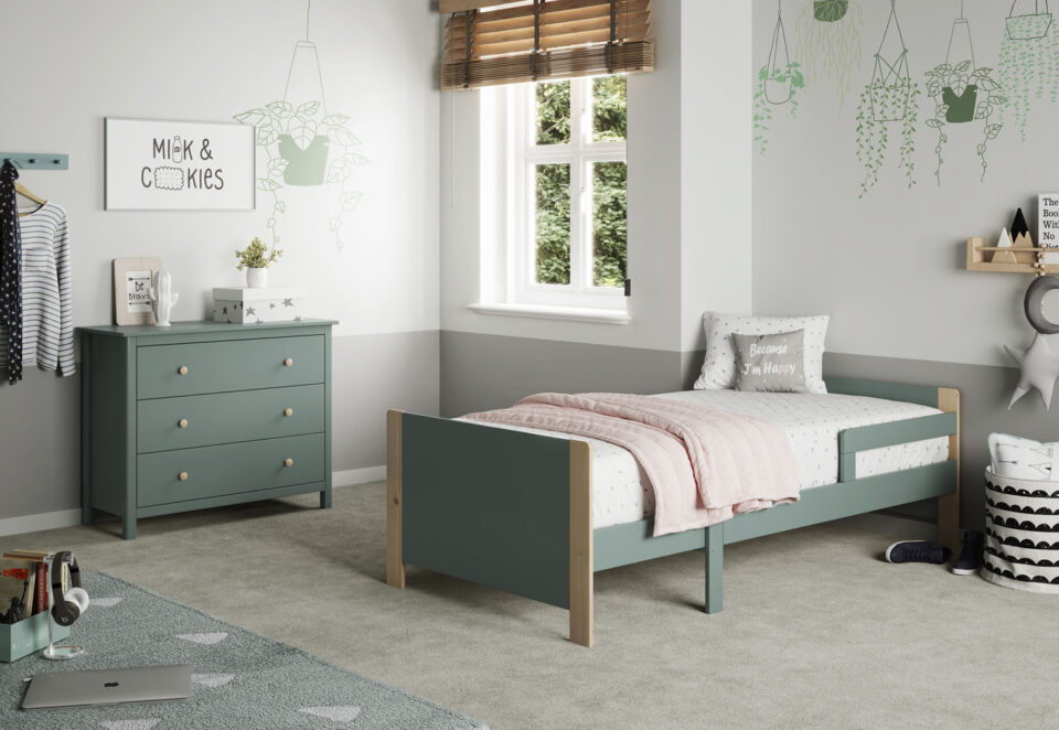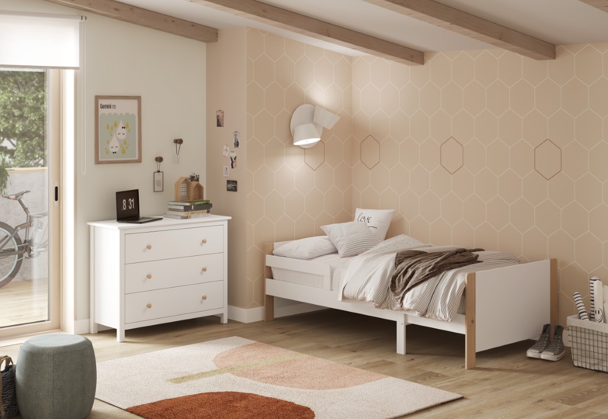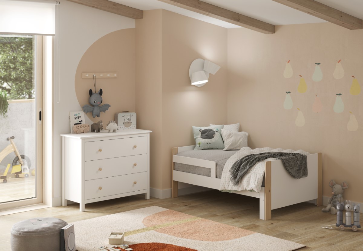 Nasvet za opremo: Kombinirajte s tekstilom v toplih nevtralnih tonih za pomirjujoče okolje, idealno za prehod iz posteljice v prvo pravo posteljo.