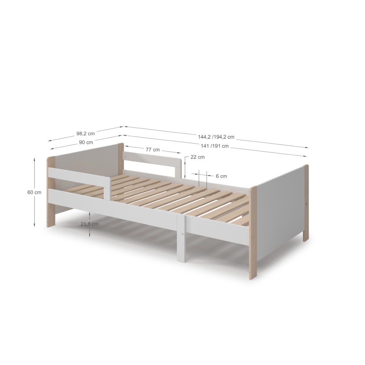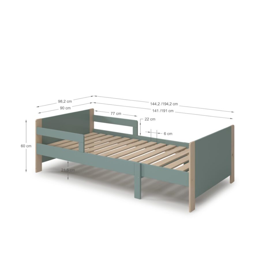 Otroška postelja Willi raste skupaj z vašim otrokom – zahvaljujoč prilagodljivi dolžini od 140 do 190 cm. Masiven videz, zaobljeni robovi in zaščitna ograjica zagotavljajo varnost in udobje v otroški sobi.