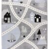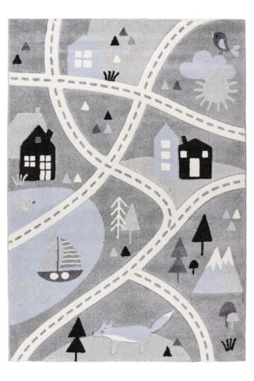 Otroška preproga Happy HAP 310 Silver prinaša zabavno in pustolovsko vzdušje v otroško sobo s svojim edinstvenim motivom ceste, hišic, dreves in živali. Na sivi podlagi so upodobljene poti, ki vodijo mimo hiš, gozdov, hribov, jezera z ladjo in živalskega sveta, kar omogoča otrokom ustvarjanje različnih zgodb in domišljijskih potovanj kar na preprogi.