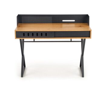 Pisalna miza B-43 bo s svojo eleganco in stilom takoj pritegnila vašo pozornost. Njena delovna plošča je izdelana iz furniranega MDF-ja v zlati hrastovi barvi, medtem ko so noge iz črnega prašno lakiranega jekla, kar ustvarja uravnotežen in prefinjen videz. Miza, z dimenzijami 110 x 51 x 90 cm, je dostavljena v razstavljenem stanju in ima največjo nosilnost 30 kg. Pod delovno ploščo se nahaja odprt in zaprt prostor za shranjevanje, zadnjo stran pa krasi perforiran kovinski paravan, ki poudarja tako estetiko kot funkcionalnost. S svojim industrijskim slogom je ta miza izjemno priljubljena in iskan kos pohištva. Ne bo le praktična, temveč bo tudi osupljiv oblikovalski poudarek v vsaki študentski sobi ali pisarni.