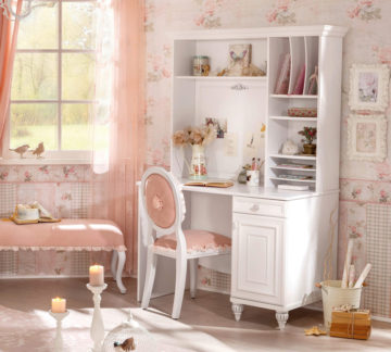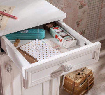Pisalna miza Romantica ima en predal in ena vrata, ki se mehko zapirajo. Za vrati se skrivajo dodatne police, kamor lahko pospravite zvezke in ostale potrebščine. Predalnik ob strani je na visokih rustikalnih nogah. Na voljo je v brezčasni beli barvi z rustikalnimi dodatki. Zaščitena je z melaminom, odpornim proti praskam in prahu. Ob doplačilu priporočamo študijsko enoto, ki zagotavlja dodaten prostor za shranjevanje knjig, pripomočkov in ostale literature.