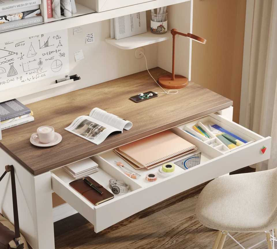 Trpežna konstrukcija nog iz MDF profila zagotavlja stabilnost, velik prostor za predale in posebne pregrade pa ponujajo organizirano uporabo. Poseben plastični nosilec za pisala je mogoče namestiti na desno ali levo stran glede na želje uporabnika. Predali s sistemom tandemskih tirnic z mehkim zapiranjem zagotavljajo tiho in gladko delovanje, z nosilnostjo 30 kg pa ponujajo dolgotrajno izkušnjo. Robovi so ojačani z 2 mm debelim robnim trakom, fiksna polica pod mizo pa ustvarja dodaten prostor za shranjevanje. Obešalnik za torbe je mogoče namestiti na desno ali levo stran glede na želje uporabnika.