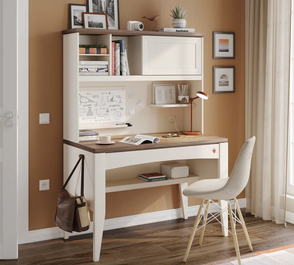 Študijska enota Lapel, ki se odlično dopolnjuje z mizo Lapel, je zasnovana v barvni kombinaciji Hamilton in Vario Mink Cream. Zgornja površina je v barvi Hamilton in ima velik prostor za shranjevanje z drsnimi vrati, ki vam omogoča organizirano shranjevanje vaših stvari. Bela tabla vam omogoča zapisovanje s pisalom, kovinska polica spodaj pa zagotavlja praktično shranjevanje predmetov, kot so tablice, mobilni telefoni, pisala in radirke.