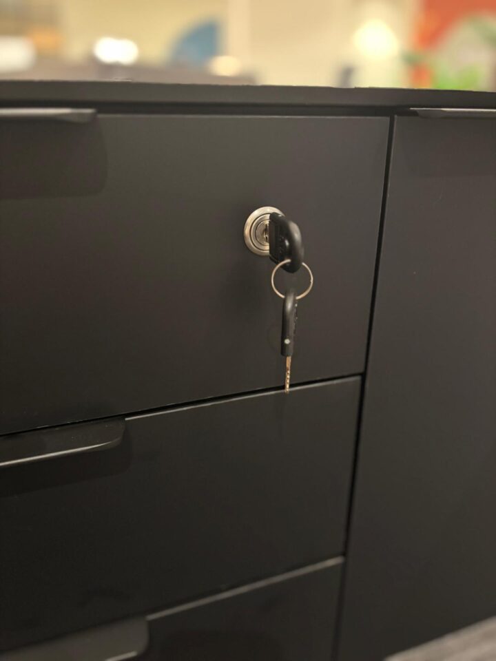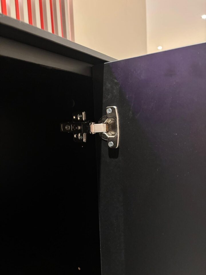 Dodatna omarica je izdelana iz 18 mm MDF-ja z zgornjo ploščo debeline 8 mm. Površina je obdelana z enakim lakom kot delovna plošča, kar zagotavlja enotnost in vzdržljivost. Predali so opremljeni s teleskopskimi vodili in mehkim zapiranjem, kar omogoča tiho in nemoteno delovanje. Vrata omarice so povezana s tečaji z mehkim zapiranjem, vogali pa so zakrivljeni s pomočjo ukrivljenih MDF panelov za dodano varnost in estetiko.
