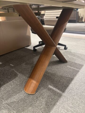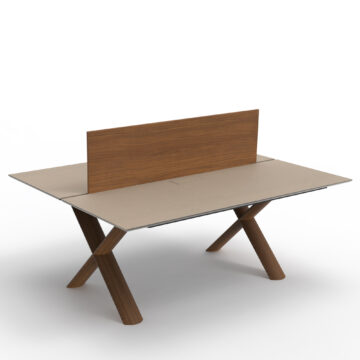 Miza ima sredinsko pregrado, ki omogoča diskretnost in organizacijo za oba uporabnika. Na vsaki od pisarniških miz se na sredini tudi nahaja luknja s pokrov za pritrditev vtičnice. Križno oblikovane noge iz aluminija oblečene v les zagotavljajo trdnost in sodoben videz.