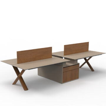 Križno oblikovane noge iz aluminijastega profila, oblečene v les, zagotavljajo izjemno stabilnost in sodoben videz, ki se odlično prilagaja različnim pisarniškim slogom.