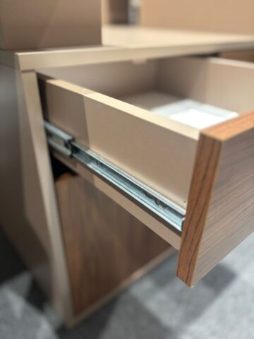 Z vzdržljivimi materiali, križno oblikovanimi nogami ter dodatnimi funkcijami, kot so luknje za vtičnice in mehko zapiranje, ustvarja brezhibno delovno izkušnjo. Za popoln pisarniški prostor preverite tudi druge pisarniške elemente iz programa Vino.