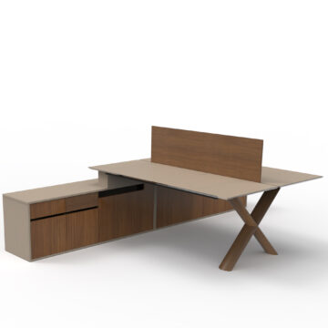 Križno oblikovane noge iz aluminijastega profila, oblečene v les, zagotavljajo izjemno trdnost in eleganten sodoben videz, ki se brez težav prilagodi različnim pisarniškim slogom.