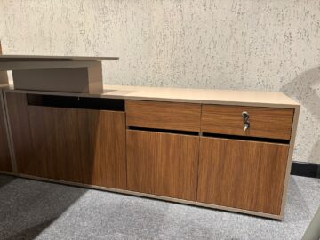 Dodatna večja pisarniška komoda na eni strani ponuja obilo prostora za shranjevanje in organizacijo dokumentov. Sestavljena je iz štirih vrat in dveh predalov za vsak delovni prostor. Vse je opremljeno z mehkim zapiranjem. Sodobni kovinski ročaji poudarijo prefinjen dizajn, medtem ko premišljena zasnova omogoča, da so vse pomembne stvari vedno na dosegu roke.