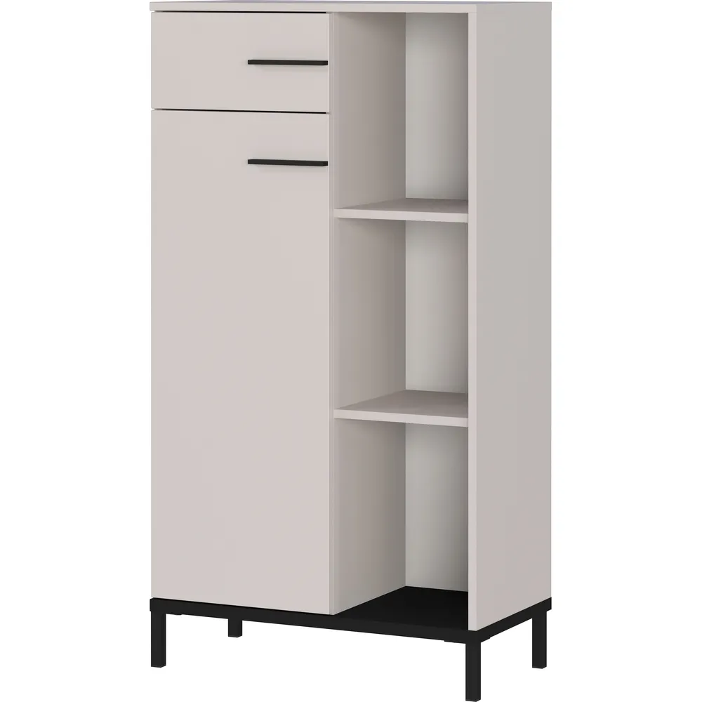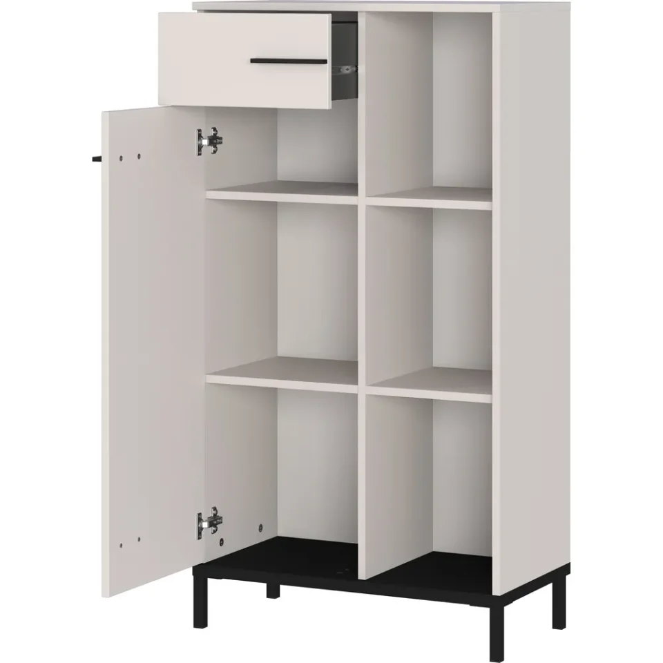 Omara je izdelana iz oplemenitene iverne plošče s površino, odporno na praske, ter robovi ABS, ki zagotavljajo dodatno zaščito in dolgotrajno uporabo. Vrata lahko pritrdite levo ali desno, notranje police pa so nastavljive in omogočajo prilagoditev različnim višinam map in pisarniškega materiala. Mehko zapiranje zagotavlja tiho in udobno uporabo.