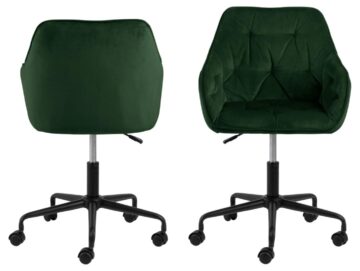 Pisarniški stol Brooke združuje udobje in stil, zaradi česar je popolna izbira za domačo pisarno ali mladinsko sobo. Oblazinjen v mehko žametno tkanino v gozdno zeleni barvi, ta stol z dekorativnimi prešitji prinaša pridih luksuza in elegance. Zaradi posebne žametne tkanine se barva spreminja glede na svetlobo in smer vlaken, kar stolu daje bogat in živahen videz. Podstavek iz črnega praškasto prevlečenega jekla z zvezdasto osnovo in kolesci z zavornim mehanizmom zagotavlja varnost in stabilnost, medtem ko vam omogoča vrtenje in prilagajanje višine.