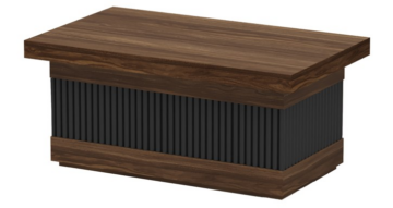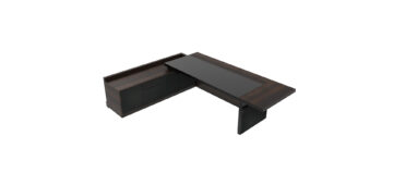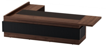 - Kotna direktorska miza: Izdelana iz 18 mm debele melaminsko prevlečene iverne plošče v oreh barvi s črnimi detajli. Površina je odporna proti obrabi in praskam, robovi pa so dodatno zaščiteni z aluminijastim profilom in 1 mm PVC trakom za večjo trpežnost in eleganten zaključek.
