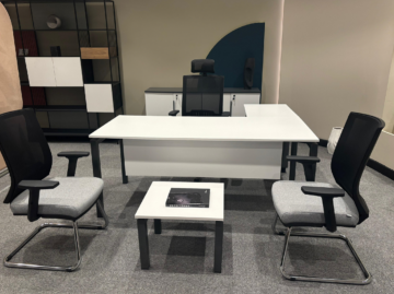 Pisarniško pohištvo Galaksija – direktorski sestav, VEČ DIMENZIJ je idealna rešitev za sodobne vodstvene pisarne, kjer je potrebna premišljena organizacija. Sestav združuje delovno mizo, komodo z zaklepanjem, predalnik z zaklepanjem in klubsko mizico.