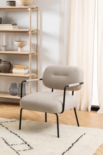 Vsak dom lahko dobi hotelski občutek s tem bež počivalnikom. Njegova okrogla oblika, udobne blazine, zunanji črni tubularni okvir in nizko nameščen sedež ustvarjajo eleganten in sodoben kos pohištva. Pokrit z strukturno tkanino z dvotonskim učinkom, stol postane še vizualno zanimivejši, saj dodaja dimenzijo.