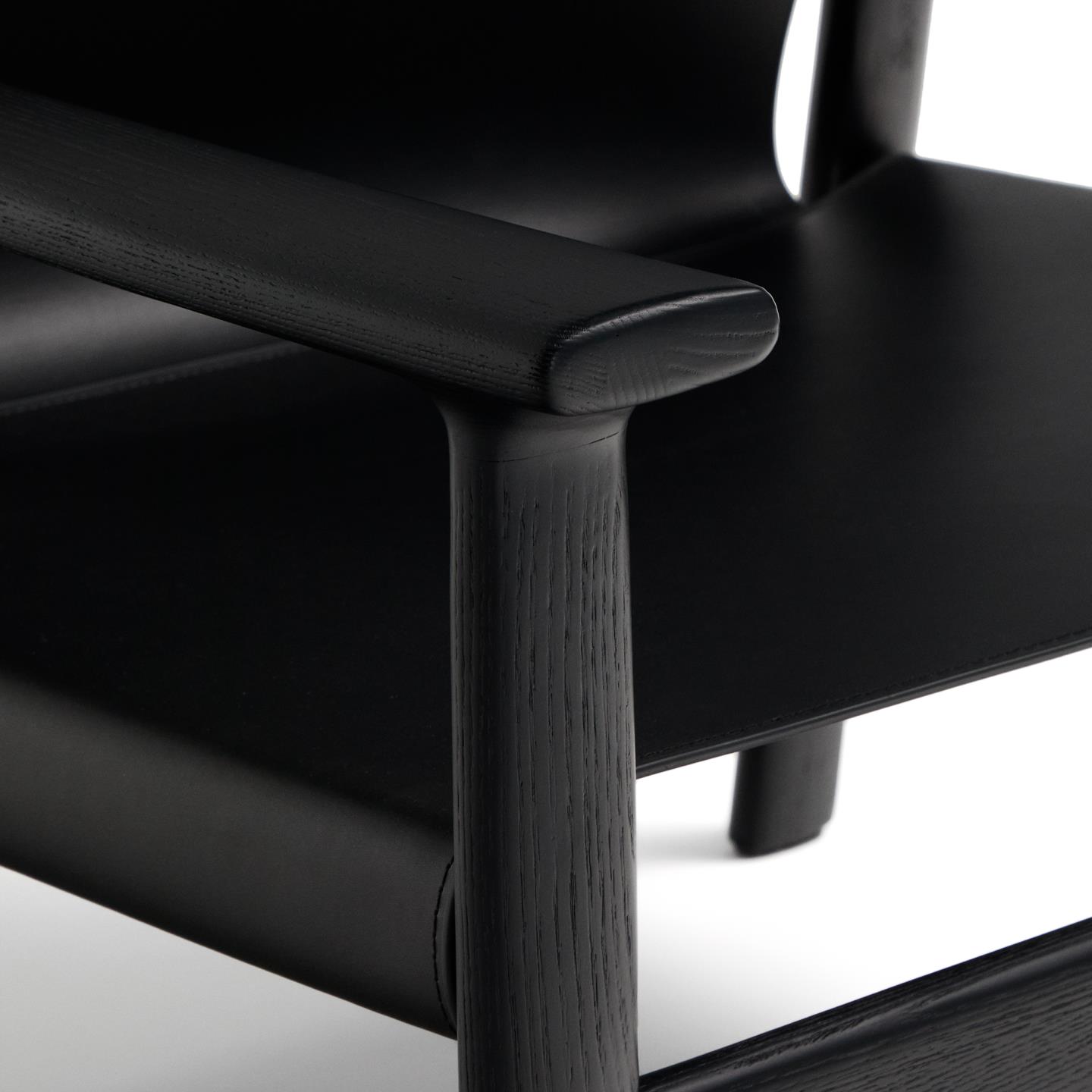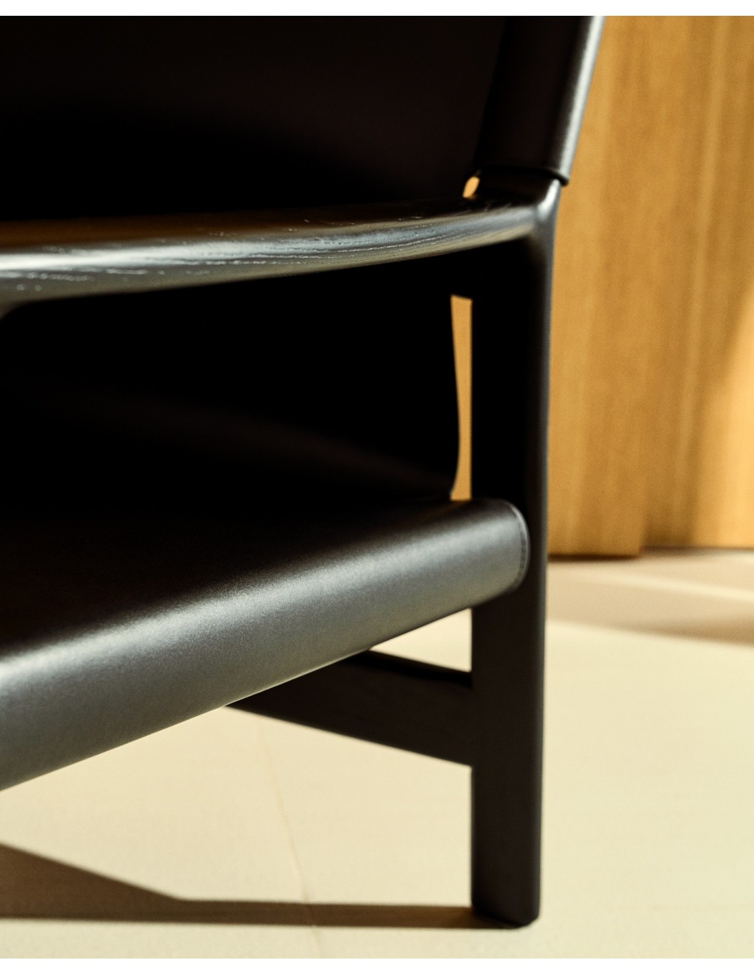 Ogrodje iz masivnega jesena s FSC™ 100-odstotnim certifikatom potrjuje odgovorno pridobivanje lesa iz nadzorovanih gozdov ter zagotavlja stabilnost in toplino materiala. Sedež iz recikliranega usnja je izbran zaradi odpornosti proti obrabi in ognju ter omogoča čvrsto, telesu prilagojeno sedenje. Dobavitelj usnja je certificiran s strani Leather Working Group z oceno LWG Gold, kar potrjuje trajnostne postopke v proizvodnji. Za dodatno zaščito tal so na nogah nameščeni zaščitni čepi, ki poudarjajo uporabno vrednost izdelka brez kompromisov pri dizajnu.
