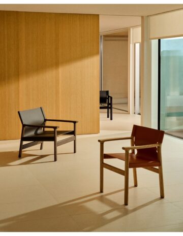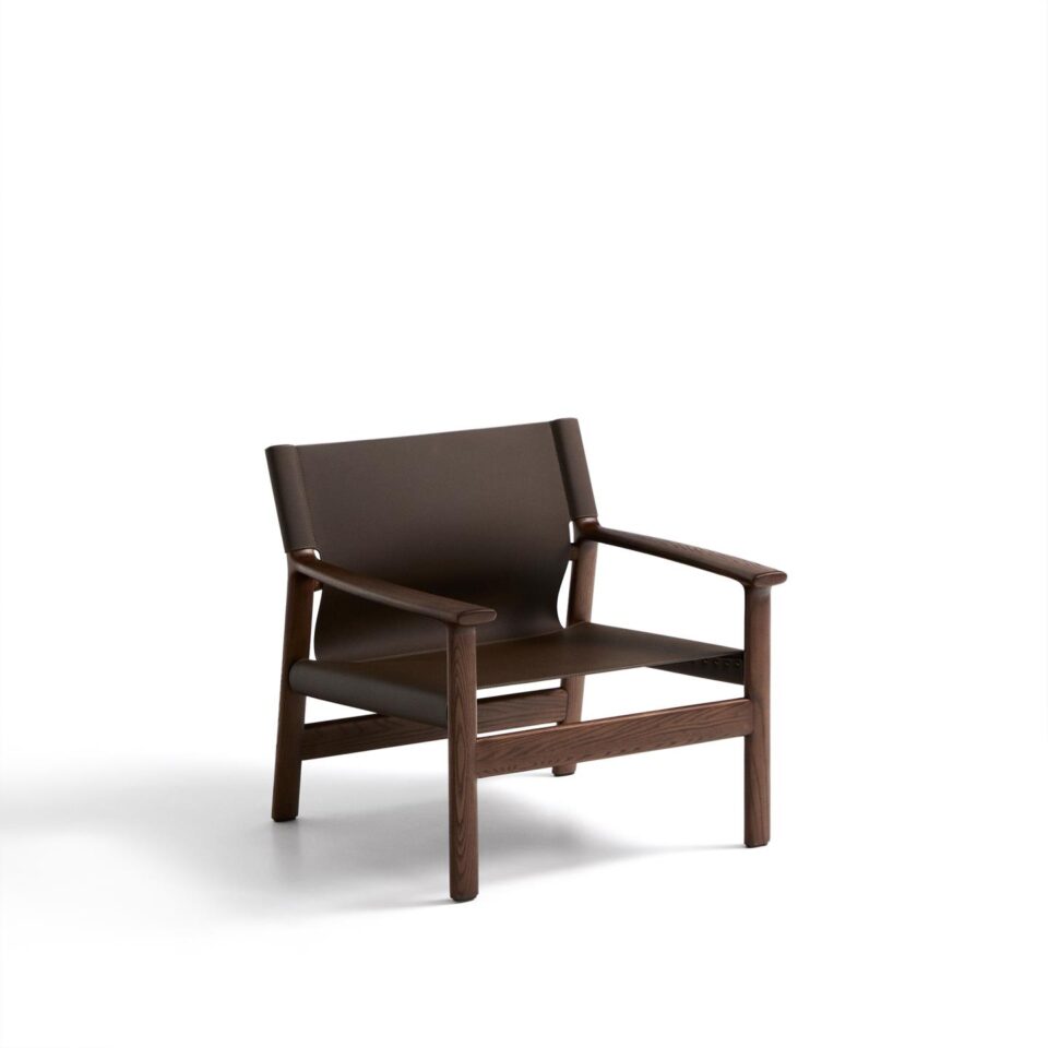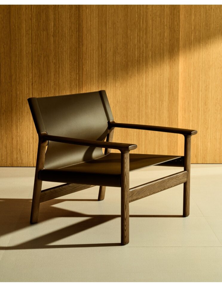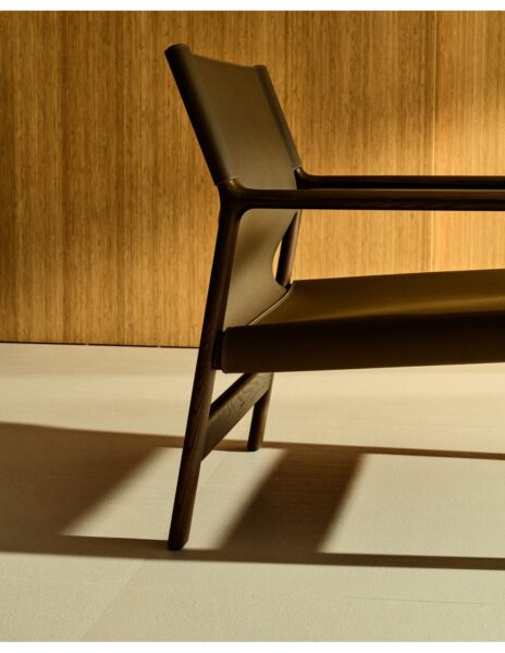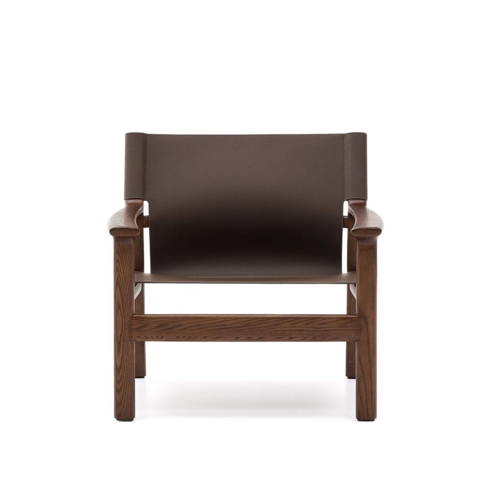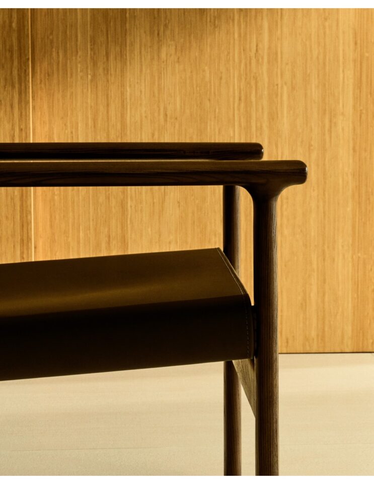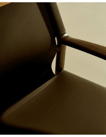 Ogrodje iz masivnega jesena s FSC™ 100-odstotnim certifikatom potrjuje odgovorno pridobivanje lesa iz nadzorovanih gozdov ter zagotavlja stabilnost in toplino materiala. Sedež iz recikliranega usnja je izbran zaradi odpornosti proti obrabi in ognju ter omogoča čvrsto, telesu prilagojeno sedenje. Dobavitelj usnja je certificiran s strani Leather Working Group z oceno LWG Gold, kar potrjuje trajnostne postopke v proizvodnji. Za dodatno zaščito tal so na nogah nameščeni zaščitni čepi, ki poudarjajo uporabno vrednost izdelka brez kompromisov pri dizajnu.