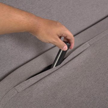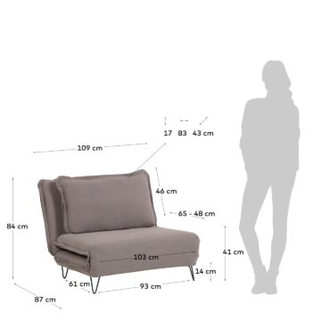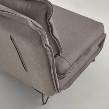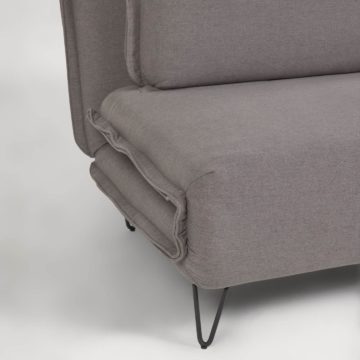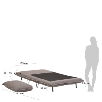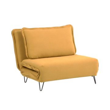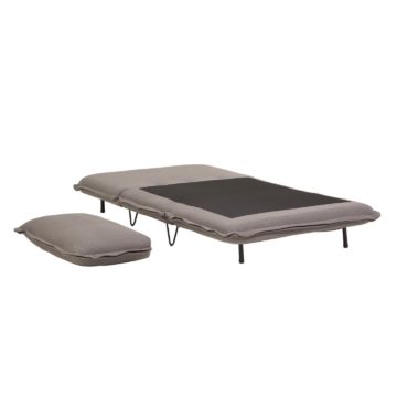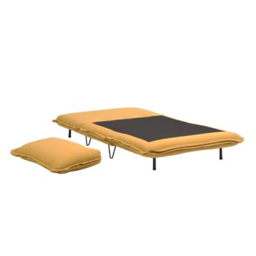 Praktičen in inovativen počivalnik Miski se lahko raztegne in služi kot ležišče, dolgo 191 cm. Ima črno obarvane lesene nogice iz borovega lesa. Je udoben in mehak, saj je oblazinjen s poliuretansko peno. Tkanina je na voljo v gorčično rumeni in sivi barvi. Blazina iz fotografije je vključena v ceno.
