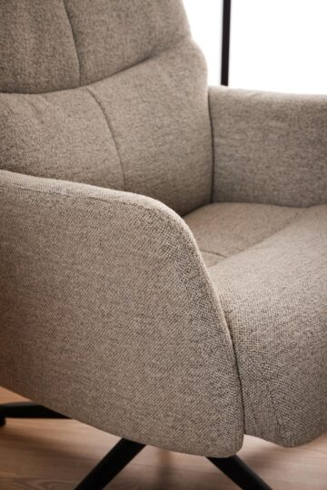 Počivalnik London prinaša sofisticiranost in udobje v vaš dom, obogaten s usklajenim footstoolom. Oblazinjeni sedež je oblečen v mehko bež bouclé tkanino, okrašen s horizontalnim šivanjem, kar mu daje teksturiran videz, ki se lepo prilega različnim notranjim stilom. Ročna funkcija nagibanja omogoča prilagoditev za dodatno udobje.
