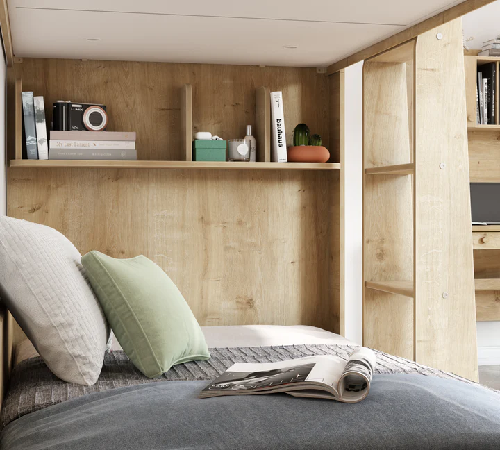 Pogradna postelja Mocha s svojo kompaktno zasnovo učinkovito izkorišča prostor v majhnih sobah, robustna konstrukcija in varnostne funkcije pa jo uvrščajo med najboljše izbire med pogradi. Z dimenzijami 90 x 200 cm ponuja veliko prostora za spanje zgoraj in spodaj. Stranske ograje, stopniščne obloge in zaobljene linije zagotavljajo varno uporabo za otroke.