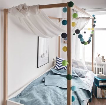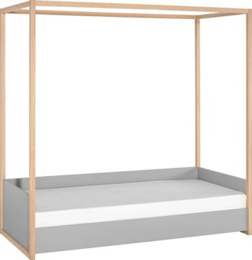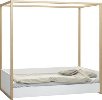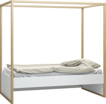 Dno postelje z baldahinom lahko nastavimo po višini, ali je povsem pri dnu, ali pa je za nekaj deset centimetrov dvignjeno nad tlom. To določimo pri montaži. Barve: bela-hrast ali siva-hrast. Dimenzije (dolžina x globina x višina): 97,5 x 208 x 207,5 cm. V posteljo ustreza ležišče dimenzije 90 x 200 cm. Ležišče in letveno dno nista vključena v ceno. Narejena je iz iverala, ki je zaščiten z melaminom vrhunske kakovosti.