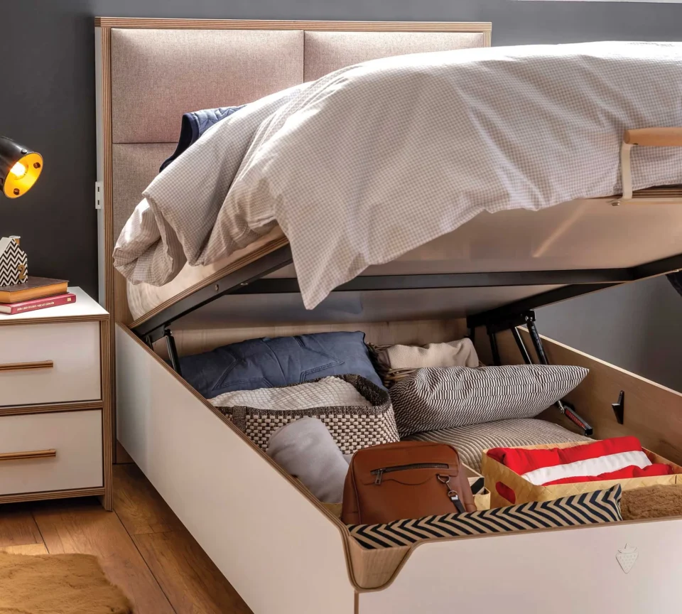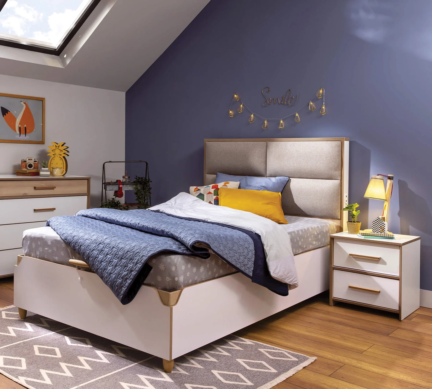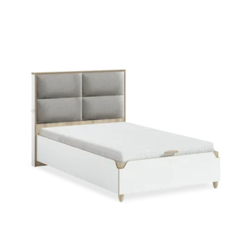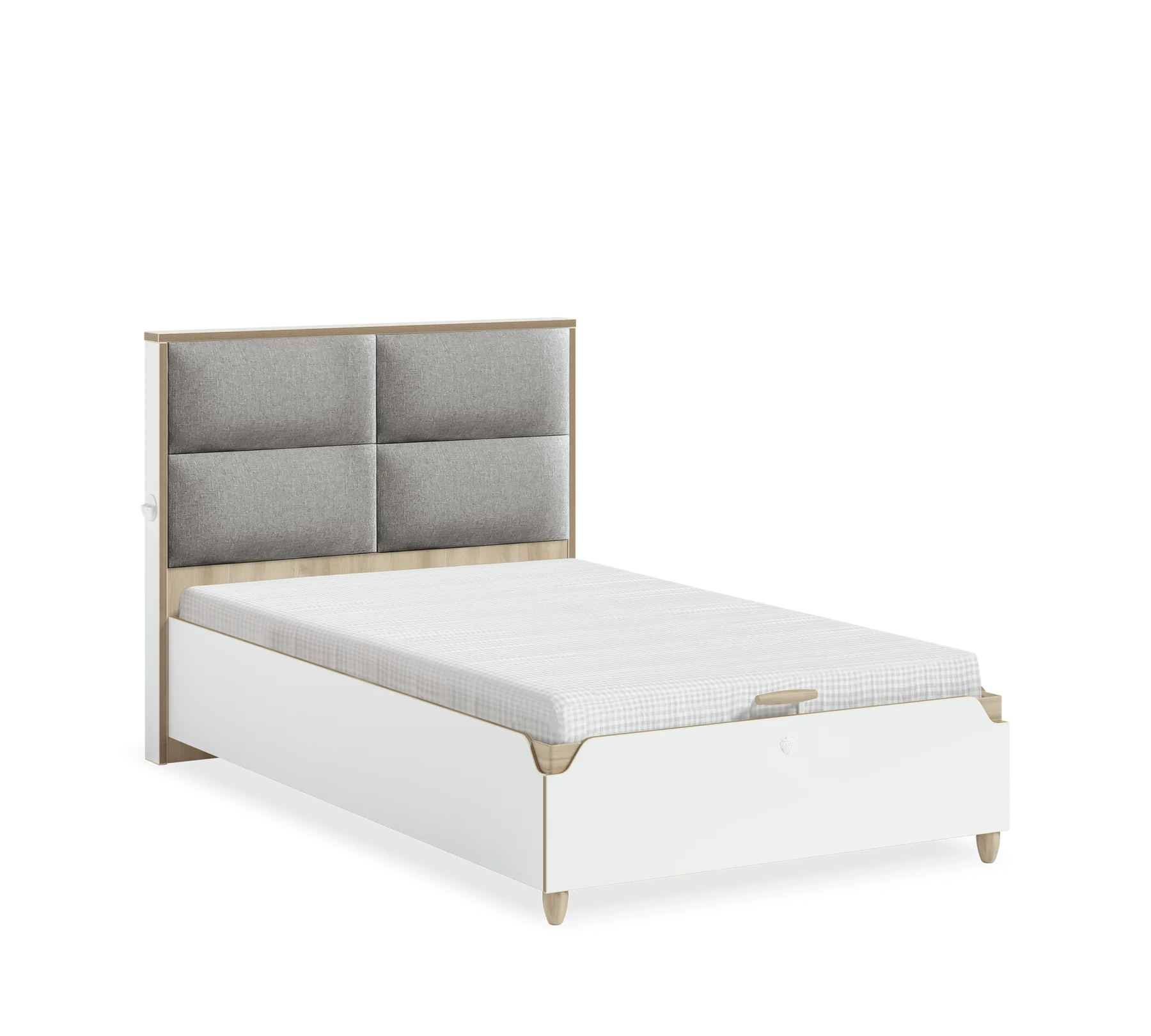 Posteljni okvir Modera s dvižnim podnožjem se ponaša s preprostim in športnim dizajnom, ki sovpada s sodobnim slogom celotne serije. Vzglavje je izdelano iz lahko čistljivega blaga in mehkih materialov, kar povečuje udobje postelje. Dodatna varnostna ključavnica in zavorni sistem z blažilniki omogočata varno in tiho odpiranje ter zapiranje podnožja.