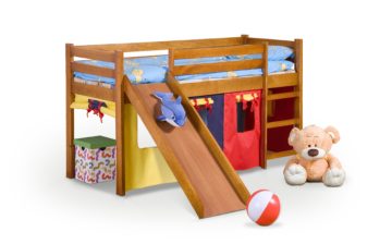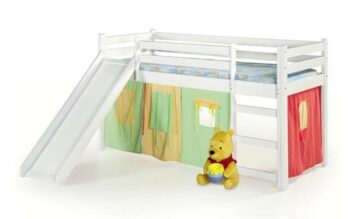 Postelja NEO PLUS v večih barvah. Postelja je dvignjena in se je nanjo potrebno povzpeti po stopnicah. Tako je pod posteljo veliko igralnega prostora. Za dodatno razvedrilo in lažje sestopanje iz pograda je dodan tobogan. Za zaščito je okoli postelje dodana ograja.