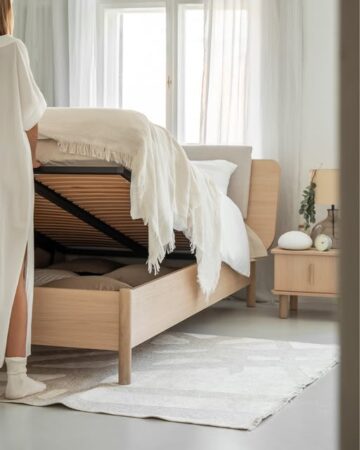 Postelja OMM je idealna izbira za vse, ki si želijo naravne topline, zaobljenega dizajna in funkcionalnega udobja v svoji spalnici.