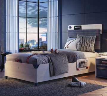 Postelja Trio je na voljo v barvni kombinaciji svetlega lesa, temno modre in rdeče. Postelja je primerna za vzmetnici dimenzij 100 x 200 cm in 120 x 200 cm. Na vzglavju ima vhodni adapter USB, ki je na voljo za polnjenje mobilnih telefonov in tabličnih računalnikov. Ob strani ima žep za shranjevanje stvari, pod posteljo pa se skriva velik predal. Zasnovan je s sodobnimi linijami in ergonomsko. Nosilnost postelje je največ 130 kg. Zaščitena je z melaminom, ki je odporen zoper prask in praha. Posteljno dno vključeno. Cena ne vključuje vzmetnice in posteljnine.