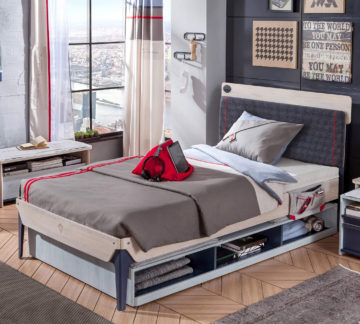 Postelja Trio je na voljo v barvni kombinaciji svetlega lesa, temno modre in rdeče. Postelja je primerna za vzmetnici dimenzij 100 x 200 cm in 120 x 200 cm. Zadaj ima dodaten prostor za shranjevanje knjig, prav tako pa ima ob strani dodan žep. Ob doplačilu vam priporočamo nakup dodatnega ležišča. Ta lahko služi kot postelja ali predal za shranjevanje stvari. Zaščitena je z melaminom, ki je odporen zoper prask in praha. Posteljno dno vključeno. Cena ne vključuje vzmetnice in posteljnine.