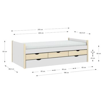 Otroška postelja Valka je izdelana iz trpežnega masivnega bora in ponuja dodatno ležišče, ki se izvleče. Vključuje tudi prostor za shranjevanje, kar omogoča dodatno urejenost prostora. Postelja je opremljena z letvenim dnom za udobno spanje. Ta vsestranska postelja je primerna za različne otroške sobe in je dobra rešitev za družine z več otroki ali tiste, ki pogosto sprejemajo goste. Dodatno ležišče se enostavno izvleče, ko je potrebno, in se pospravi, ko ga ne potrebujete, kar prihrani prostor. Je trpežna in stabilna ter zasnovana za dolgotrajno uporabo.