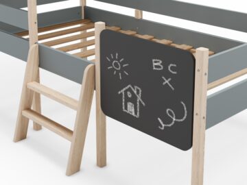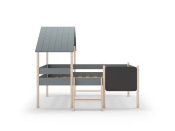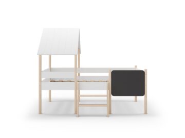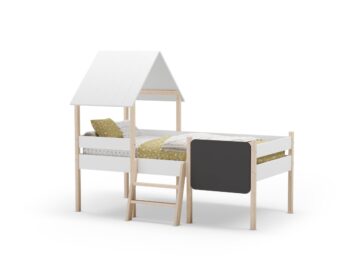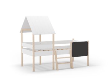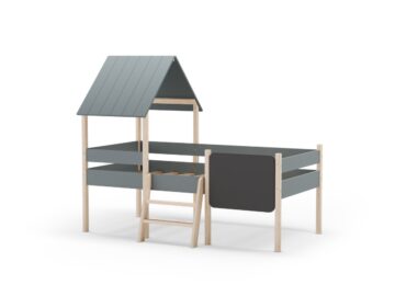 Domiselna otroška postelja Mint v obliki hišice ustvarja igrivo in varno okolje za spanje in vsakodnevno domišljijsko igro. Višja konstrukcija omogoča dodaten prostor pod posteljo, ki ga lahko uporabite za shranjevanje ali kot igralni kotiček.