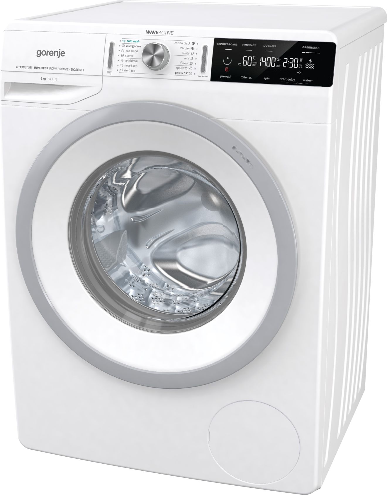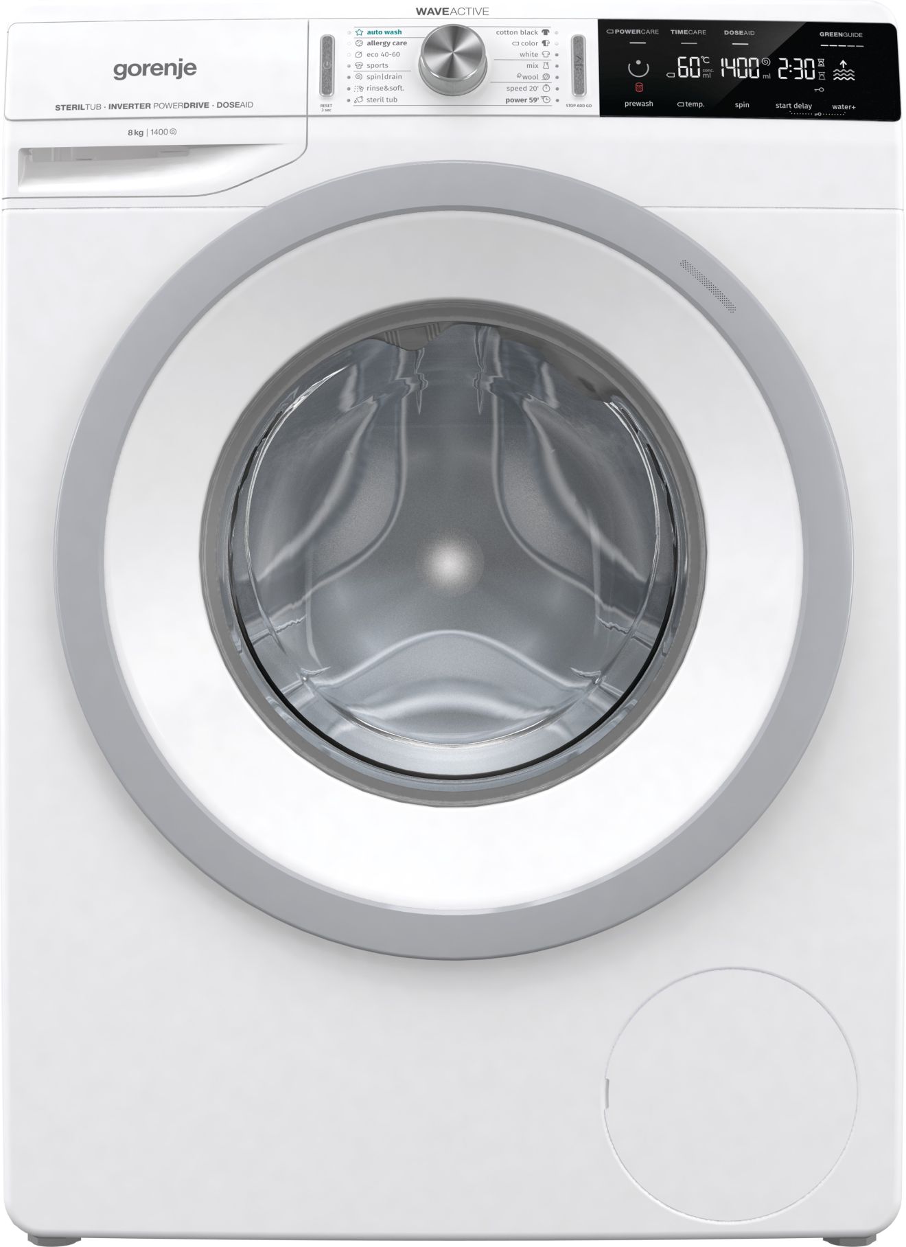 Prednastavitev začetka pranja StartDelay omogoča prilagodljivost pri načrtovanju pranja, funkcija GreenGuide pa pomaga pri izbiri najbolj okolju prijaznega programa. Pralni stroj ima 14 programov, vključno s posebnimi programi, kot so AllergyCare, AutoWash, SportWash, Power 59′ in Speed 20′.