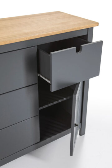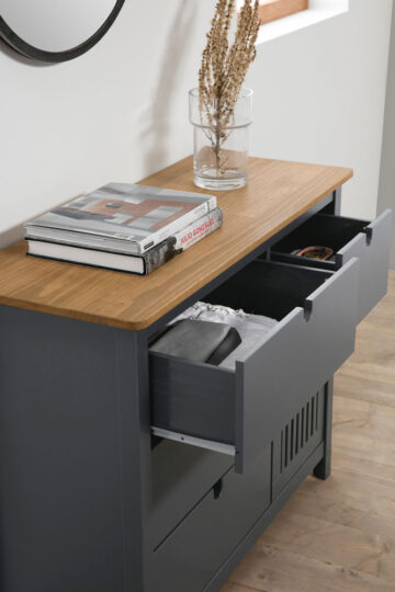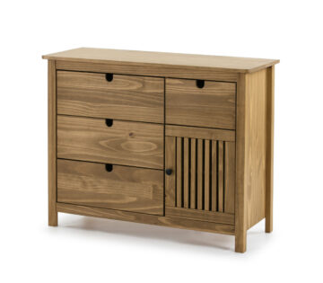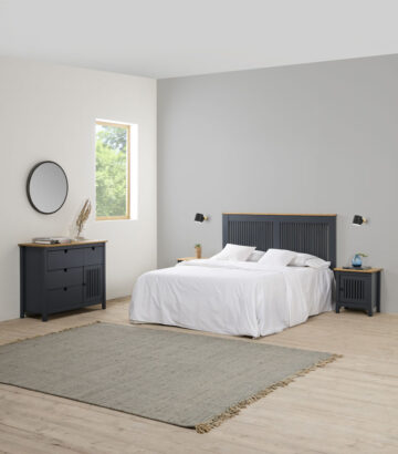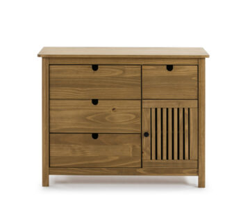 Izdelan iz kakovostnega borovega lesa, predalnik Bruna je na voljo v dveh barvnih različicah: naravni barvi lesa ali v sodobni sivi barvi. Obe različici so obdelani z voskom, ki poudarja lepoto naravnega lesa, hkrati pa nudi zaščito in olajšuje vzdrževanje. Voskana obdelava daje predalniku topel občutek in ščiti les pred obrabo.