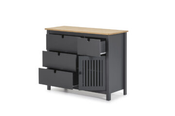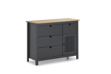 Predalnik Bruna, na voljo v izvedbi s tremi predali, enem manjšem predalu in enih vratih, je vsestranski in eleganten kos pohištva. Dimenzije predalnika so 40 cm v globino, 100 cm v širino in 80 cm v višino, kar omogoča praktično shranjevalno rešitev brez zavzemanja prekomernega prostora.