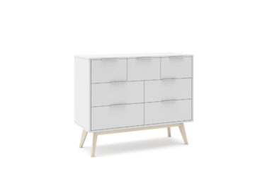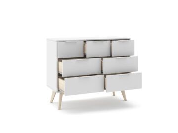 Izdelana iz kakovostnega in trpežnega materiala, komoda Campus zagotavlja dolgotrajno uporabo in stabilnost. Njena bela barva, dopolnjena z belim voskom, daje komodi čist in svež videz, ki se enostavno vključi v različne dekorativne sloge, od minimalističnih do bolj tradicionalnih.