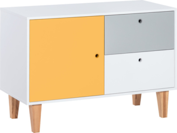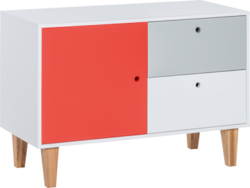 Predalnik Concept je svež, mladosten izdelek, ki prinese v prostor razigranost in kanček barvitosti. Narejen je iz iverne plošče, zaščiten pa je z melaminom vrhunske kakovosti. Nogice so masivne. Ima dva predala, ki se mehko zapirajo in ena vrata. Vrata lahko po želji obarvate na 4 različne barve, in sicer: hrast, rdeča, rumena in modra, črna in roza.