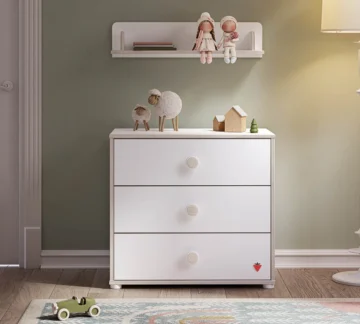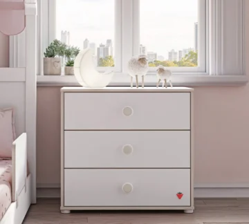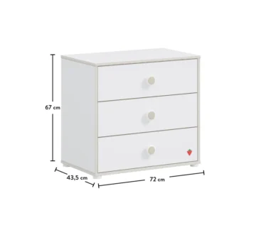 Bela majhna komoda Montes, zasnovana posebej za vašega otroka, pritegne pozornost s svojo funkcionalno zasnovo, sestavljeno iz treh predalov. Prvi predal, kjer lahko organizirate osebne stvari vašega dojenčka, kot so nogavice in škorenjčki, je razdeljen, hkrati pa imajo vsi predali mehko zapiranje. Posebni premazani ročaji, ki so na voljo v dveh različnih vzorcih in barvah, ustvarjajo popolno harmonijo z belo komodo. Komodo, ki je bila zasnovana po načelu “pomagaj mi, da naredim sam” filozofije vzgoje montessori, lahko uporabite tudi pod visoko pograd posteljo Montes.