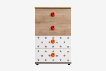 Predalnik iz kolekcije Montessori Star, zasnovan s štirimi predali in funkcijo mehkega zapiranja, je idealna rešitev za organizirano shranjevanje v otroški sobi. Ta kos pohištva združuje praktičnost in eleganten dizajn, hkrati pa upošteva varnost in enostavnost uporabe, kar je ključnega pomena v otroškem okolju. Zgrajen je iz visokokakovostne iverne plošče debeline 18 mm za frontalne in bočne dele ter 8 mm za zadnji del, kar zagotavlja njegovo trdnost in dolgotrajnost. Robovi so obdelani s PVC trakovi debeline med 0,4 mm in 1 mm, kar ne le izboljša odpornost predalnika na obrabo in poškodbe, ampak tudi poveča varnost za otroke. Barvna paleta, ki vključuje odtenke Cadiz, Granit in Bela, omogoča, da se predalnik brez težav prilagodi različnim dekorativnim slogom in barvnim shemam otroških sob. Ta nevtralna in sofisticirana kombinacija barv ustvarja občutek mirnosti in čistosti v prostoru. Dimenzije predalnika, širina 52 cm, globina 46 cm in višina 80 cm, so idealno prilagojene potrebam otroških sob, kjer je vsak centimeter prostora pomemben. S štirimi prostornimi predali ponuja obilico prostora za shranjevanje oblačil, igrač, knjig in drugih potrebščin.