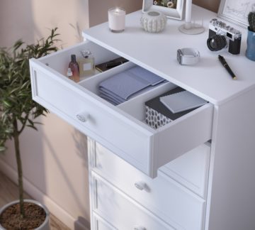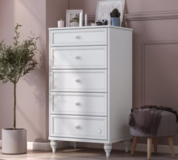 Predalnik Romantica ima ogromno prostora za shranjevanje oblačil vašega otroka. Ima kar pet predalov, ki se mehko zapirajo. Stoji na visokih čudovito izoblikovanih nogah. Pohištvo proizvajalca Cilek je zaščiteno z melaminom, zato je strah pred prahom in praskami odveč. Na voljo je v brezčasni beli barvi z rustikalnimi dodatki in nudi dovolj prostora za shranjevanje oblačil in drugih stvari.