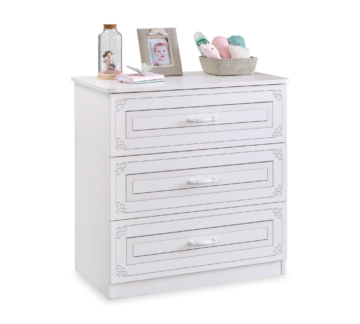 Predalnik Selena je sestavljen iz treh predalov, ki se mehko zapirajo in imajo zaobljene rustikalne ročaje. Zgornji predal je razdeljen na dva dela. Vsi imajo rustikalne dodatke v beli barvi. Na voljo je v brezčasni beli barvi in nudi dovolj prostora za shranjevanje oblačil in drugih stvari. Zaščiten je z melaminom, odpornim proti praskam in prahu. Ob doplačilu vam priporočamo rustikalno ogledalo.