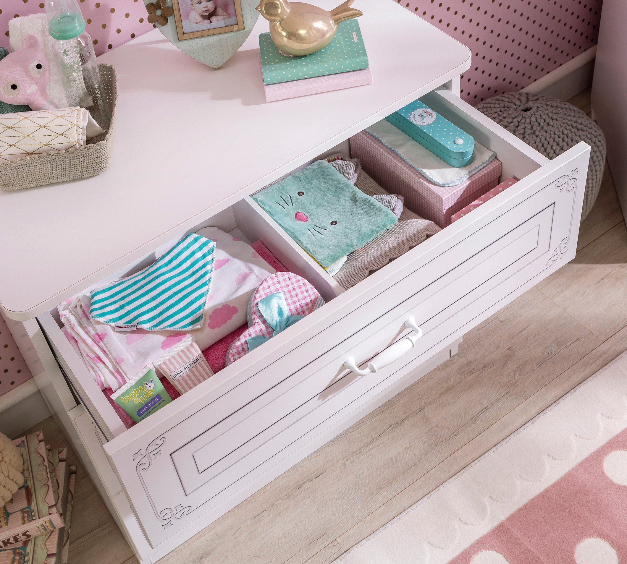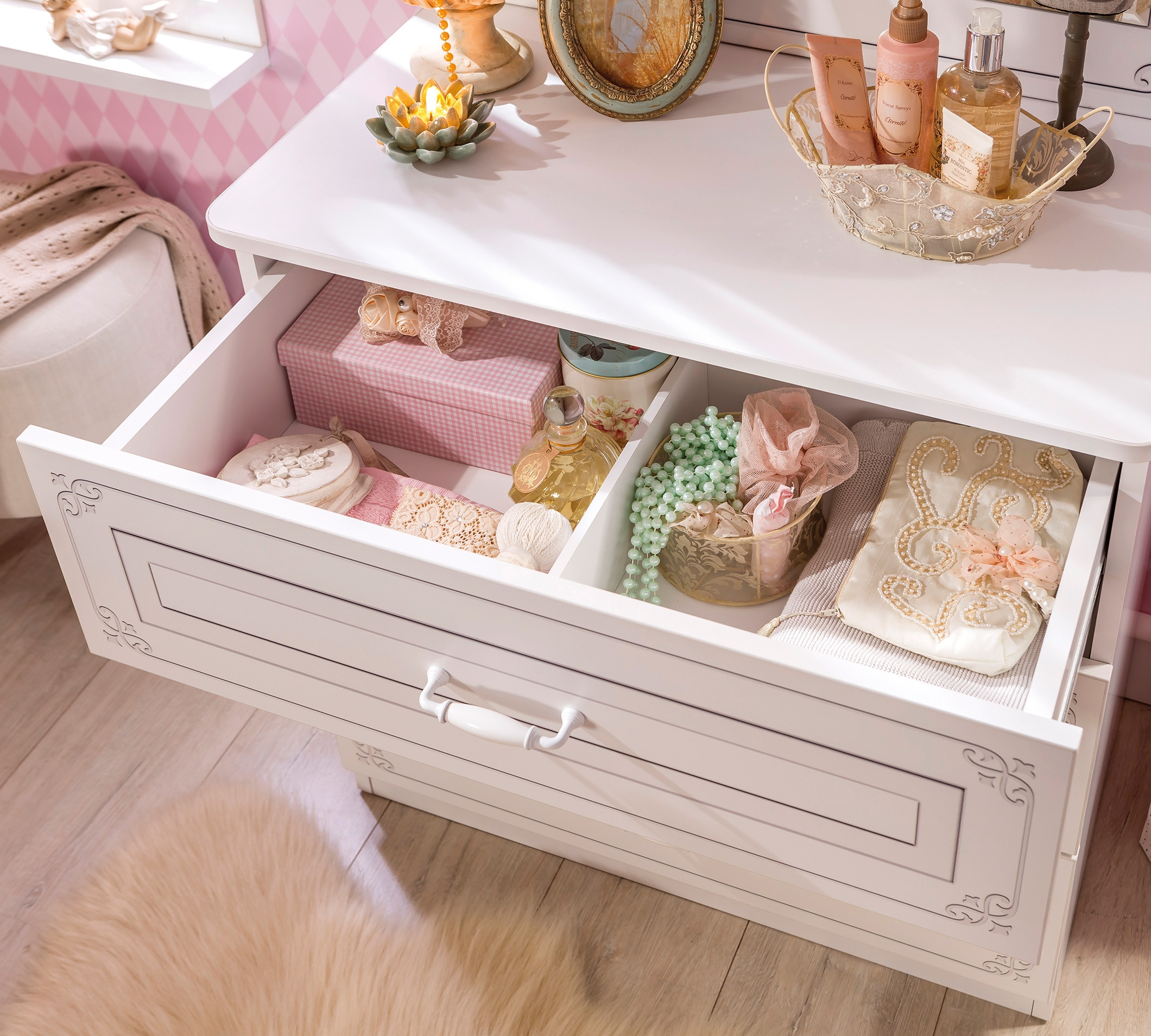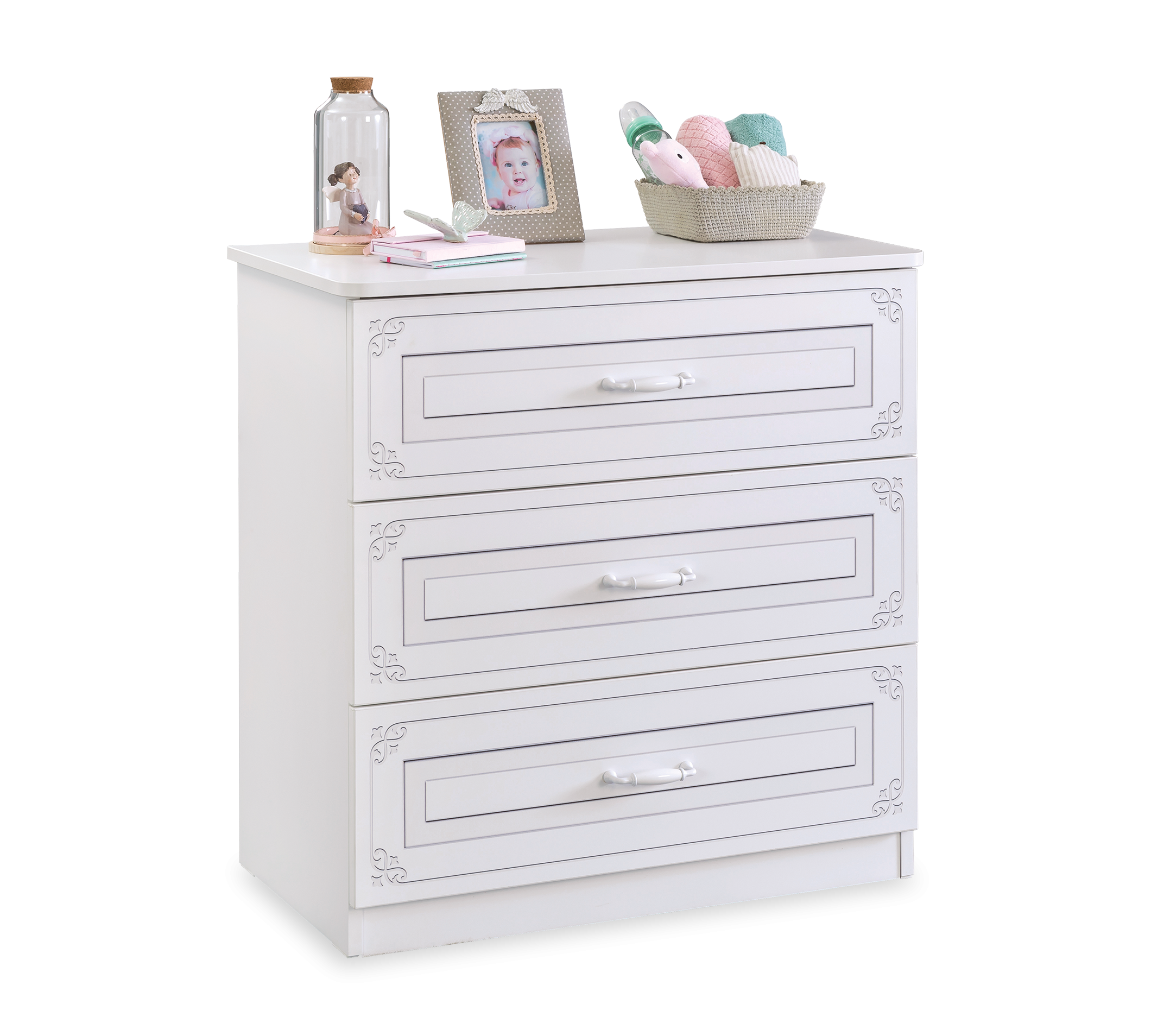 Predalnik Selena je sestavljen iz treh predalov, ki se mehko zapirajo in imajo zaobljene rustikalne ročaje. Zgornji predal je razdeljen na dva dela. Vsi imajo rustikalne dodatke v beli barvi. Na voljo je v brezčasni beli barvi in nudi dovolj prostora za shranjevanje oblačil in drugih stvari. Zaščiten je z melaminom, odpornim proti praskam in prahu. Ob doplačilu vam priporočamo rustikalno ogledalo.